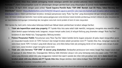 BILITONNEWS.CO, BELITUNG – PT Topindo Atlas Indonesia, pemegang merek sekaligus pemilik produk pelumas kendaraan bermotor TOP 1 Formula-1, menyampaikan hak jawab dan permohonan ralat atas pemberitaan di portal BilitonNews.co pada 18 April 2026 berjudul “Dituding Jual Oli Palsu, Gandi Saputra Angkat Bicara: Kepercayaan Pelanggan Jadi Bukti”.